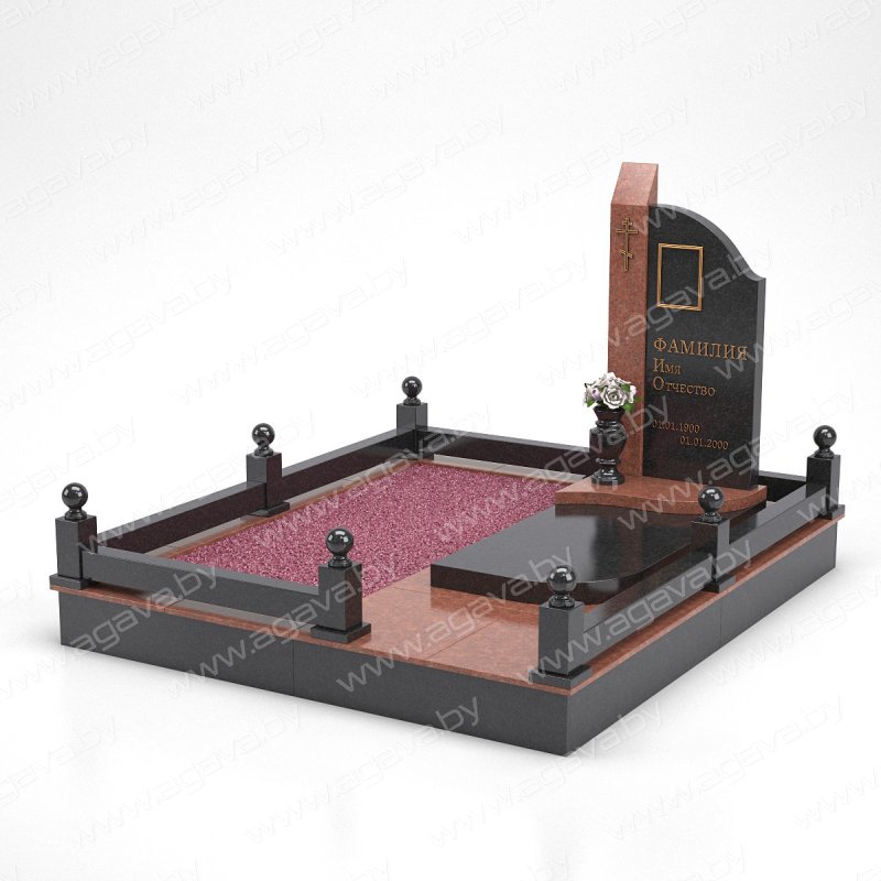 - монтажные работы: фундамент, облицованный гранитной плиткой, армированная стяжка и укладка гранитной плитки, установка памятника и гранитной ограды с шарами, установка гранитной вазы, укладка рубероида + декоративный цветной щебень (6 мешков по 20 кг) на свободное место.